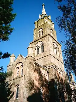 The church is constructed in sandstone and has a slate roof. It is orientated in a north–south axis and is in Romanesque Revival style. The plan consists of a five-bay nave, east and west transepts, and a chancel. All the windows are round-headed. At the south end of the church is a tower flanked by wings. The tower is in four stages, the bottom stage being in three storeys. The lowest of these storeys contains a round-headed doorway with three orders of moulding. Both of the upper storeys contain a three-light window. Each of the three upper stages is set back, with two-light bell openings in the second and third stages. The top stage consists of a drum with corner cylinders, on which is a needle spire with lucarnes. The wings flanking the tower are of a similar height to its first stage. Both have round-headed doorways with a window above, and clasping pilasters, the outer one surmounted by squat pinnacles. The east and west sides of the wings are gabled. Along the sides of the nave the windows are set in round-headed arches, and the bays are divided by pilasters. The transepts also have clasping pilasters, and at the corners these rise to two-stage turrets containing blind arcading and topped by pyramidal caps. The chancel contains three lancet windows, with a circular window above.[6]