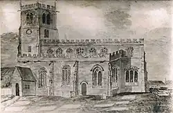 The Domesday Book (c. 1086) records the presence of a priest and a church on the site of the present church, and it is shown on an 1840 map of the town centre of Sandbach.[3] This was replaced by another church erected about the time of Henry VII. This church was built in sandstone which became badly weathered. The present church dates largely from the considerable degree of rebuilding by Sir George Gilbert Scott in 1847–49. Much of the existing fabric was replaced and the remaining fabric was encased in new stone. The east end of the church was extended by some 40 feet (12 m) and the tower was rebuilt as a copy of the former tower.[4] The builders were Cooper and Son of Derby. The stone, which came from quarries in the Mow Cop area, was given by Sir Philip Grey Egerton M.P.[5] Part of the west end had to be repaired in 1894–95 following a fire.[1] In 1930 Austin and Paley added a choir vestry, and a north porch, at a cost of £1,331.[6] The parish registers date from 1562 and are complete. The churchwardens' accounts prior to 1888 are lost.[4]