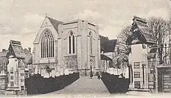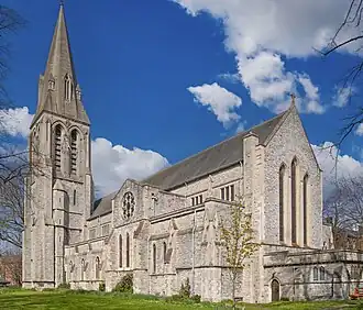 ![]() Saint Mary's Church from the southeast, showing the older tower and spire with the rebuilt body of the church | |