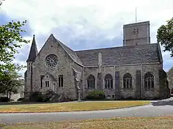 Local architects James Edward Clifton and Edmund Arthur Robinson (a son of the art curator Sir John Charles Robinson) enlarged it in 1906–08 with the addition of a north aisle and galleried transepts.[14] It is built of Purbeck stone.[15] The main entrance is at the west end of the north aisle, and has a shallow portico with a doorway in an Early English style.[16] Above that is a large window with Perpendicular tracery. An octagonal turret with stone spire adjoins the north transept.[17] A number of 18th-century monuments were retained from the earlier church.[18] The 19th-century font is Purbeck marble.[19]