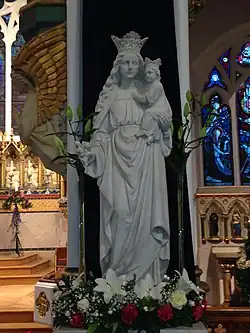 Central to the rose window, found in the North Transept is Our Lady of Perpetual Succour. This icon was brought to Liverpool in 1866 by the Redemptorists. [11]