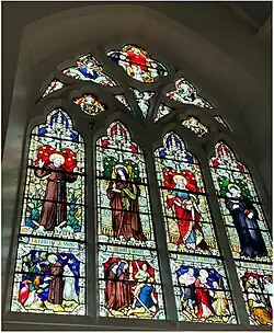 The window in the South Transept was erected to the memory of Francis and Clare Reynolds, buried outside by the church entrance, who lived in what is now Reynolds Park. The window depicts St Francis and St Clare. Francis and Clare Reynolds were members of the third order of St Francis. The other two saints Elizabeth of Hungary and St Vincent de Paul are patrons of the third order. In the small panes below each saint are scenes from their life.