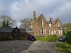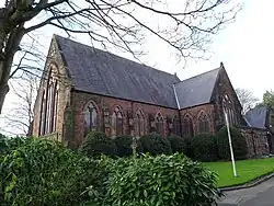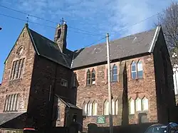 The school was built in 1869, with its entrance in Mount Street. It is constructed in red sandstone with a slate roof. The school is in two storeys and has a nine-bay front, the central bay projecting forward under a gable. The windows in the ground floor have three lights under ogee heads; those in the upper floor have two lights under cusped heads. In the gable of the projecting wing is a rose window. The school is also listed at Grade II.[3][13] The school building is now used at the Parish Hall and the ground floor is a Nursery.