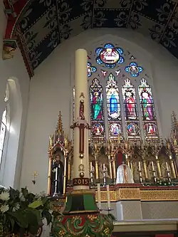 Inside the church, the high altar and reredos date from 1865, and were probably designed by E. W. Pugin. They were separated in 1948–50 by Weightman and Bullen, who placed the reredos against the east wall. The stained glass in the east window dates from 1878, and is a typical design by the Belgian stained glass painter Jean-Baptiste Capronnier.[3] The two-manual pipe organ was built by Franklin Lloyd in 1895, and is situated in a gallery on the north wall of the church at the west end.[9]