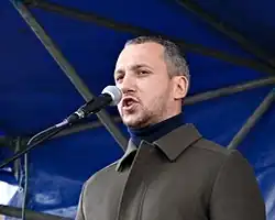The first commander of the Saint Mary's Battalion was Dmytro Linko. He was elected People's Deputy of Ukraine on the lists of the Radical Party of Oleh Lyashko.[6][7] Linko resigned as commander, but remained in the battalion as a private. Alexey Seredyuk, nickname "Borghese" became the new commander.[4]