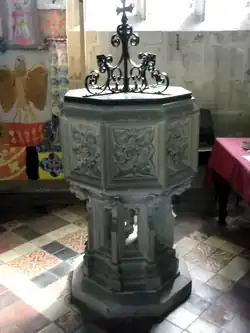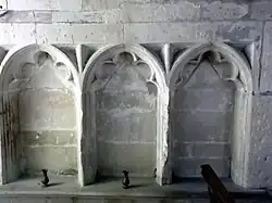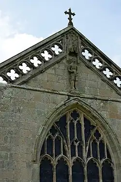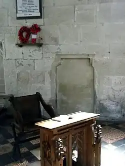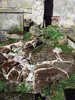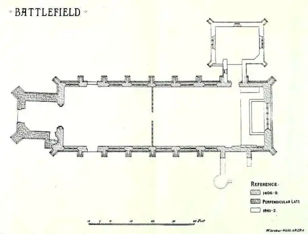 The chaplains at Battlefield initially had quarters in a three-story building next to the south side of the chancel and there are still visible remains of this.[41] Roger Philips acquired two parcels of land close to the south gate of the church and built three chambers on each to replace the old building. As he approached death in 1478 he settled these on the chaplains, on condition that they celebrate his anniversary on the Saturday after St Martin's Day (11 November) and pay 8d. annual rent to the Hussey family.[42] It is possible that a room in the church tower, which had a fireplace, also served as quarters for a resident priest.[43][44]