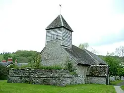 The Church of St Mary Magdalene stands in a large churchyard in the centre of the village of Bleddfa, to the south-west of Knighton. A strong local tradition asserts that a clas church was founded on the site by St Brendan the Navigator in the 6th century,[1] but there is neither documentary or built evidence to support the claim.[2] Cadw dates the present church to the early 13th century.[3] Masonry foundations exist to show that the church once had a tower,[4] by tradition this was destroyed by Owain Glyndŵr in his rebellion in 1402.[5] The present bellcote dates from 1711.[3] Restoration was undertaken in 1907 and further renovations were undertaken internally and externally in the mid-20th century, with further internal modifications in 2008.[2]
