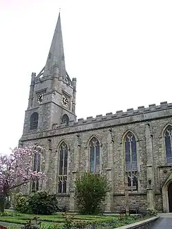 The earliest record of a church on the site is in 1122, when it was granted to Pontefract Priory.[2] The tower and east window of the present church date from the 15th century. The rest of the church was rebuilt by Thomas Rickman and Henry Hutchinson in 1828–29. In 1844 an additional stage and the spire were added to the tower.[3] The church was restored in 1881 by the Lancaster architects Paley and Austin.[4] In 1898 the timber roof and clerestory were added by Frederick Robinson.[3] In 1913, the west gallery was removed. This had contained the original organ made by Samuel Renn in 1834, which was moved elsewhere, possibly to Chester. The new organ, made by J. J. Binns, was sited at the east end of the church.[5] In 2008 a piece of the spire fell off and it was discovered that the spire was crumbling, and in 2010 an appeal was launched to raise money for its repair.[6]