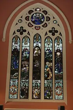 St Mary's contains four side chapels in addition to the main altar. The sanctuary is flanked by a pair of chapels, dedicated to the Sacred Heart (south) and the Blessed Virgin Mary (north). Flanking these large chapels are two smaller chapels, which front the transepts, dedicated to Saints of Ireland (south) and Saint Joseph (north). All four chapels and the sanctuary, terminate in semi-octagonal forms.
