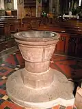 The church's font is thought to date from the late 16th century.[1][2] During restoration works that were carried out in 1827–30, the font disappeared; it was found a century later in a garden in Coven, where it had been incorporated into a rockery.[5] Prior to that, it had spent many years lying in a farmyard. The font was reinstalled in 1927, shortly after its rediscovery.[4]