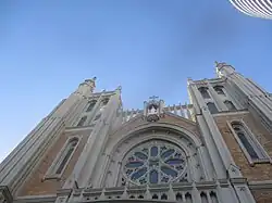The church is noted for its collection of stained glass windows, especially in a continuous series completely around the clerestory interrupted by the rose window above the narthex, a window of the crucifixion above the high altar and two spacious banks of 15 windows, one finishing the north transept (fifteen decades of the Rosary) and one finishing the south transept (the life of Saint Joseph). These windows flood the liturgical spaces of the church with light.[7]
