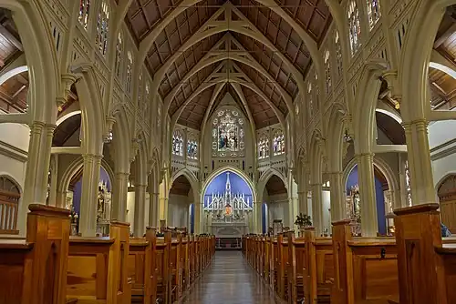 The church was closed following the July 2013 Seddon earthquake and the August 2013 Lake Grassmere earthquake sequence for structural strengthening. The church had been assessed as being between 15% and 20% of the standard a new building would be built to. In New Zealand, buildings assessed as below 33% of standard are considered "earthquake prone" and strengthening is required or a compulsory demolition can be ordered. The church re-opened in April 2017 after earthquake strengthening to 100% of code, costing $9.5 million, collected in a well-supported public fund-raising campaign. The look of the interior was largely unchanged except for the shear walls built in two locations on each side of the church near the entrance, and beside the sanctuary. All the ornate columns supporting the roof, the foundations and the copper and slate roof were replaced. Certain clerestory stained glass windows were obstructed from view on the outside of the church by the new shear walls but inside were unchanged, with the images illuminated as through the other windows, by means of artificial lighting. The effect of the seismic strengthening was generally perceived to be a restoration rather than a reconstruction, although the latter was the true situation.[13] [14] The project was undertaken by Clendon Burns & Park as the engineer and LT McGuinness as the construction company and was awarded a heritage restoration award in the 2018 New Zealand Heritage Project Awards.[15]