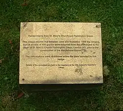The southern part of the churchyard was destroyed to make way for the approaches to Marylebone Flyover in 1968, with exhumed burials being reinterred in an area of Mill Hill Cemetery and marked with a plaque.[7]