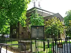 The adjoining churchyard was converted to a public park in the 1890s and is now known as St Mary's Gardens. It consists of grass with scattered trees. The grave of well-known 18th-century actress Sarah Siddons is located towards the northern end. Some headstones from the former churchyard are stacked against the west wall of the Gardens.[7]