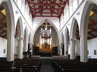 The altar and reredos are also by Sedding with carvings by Frank Tory and a centrepiece painting of the Adoration by Nathaniel Westlake. The interior is richly furnished with many of the designs by Henry Wilson. The church organ dates from 1992, it is made in the classic British style by Martin Goetze and Dominic Gwynn and is based on the early work of master organ maker Bernard Smith.[7] Next to the main entrance is a war memorial which takes the form of a plaque listing worshippers and parishioners who gave their lives in World War I. Just above the door is a statue of the Crucifixion. Next door to the church is St Matthew's House, a former Clergy House and Sunday School.[8]