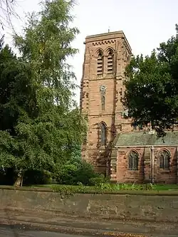 The church is built in red sandstone with Westmorland slate roofs. The plan consists of a five-bay nave with a clerestory, north and south aisles, a two-bay chancel, a north vestry and a west tower. The tower is in three stages with angle buttresses, an octagonal northeast turret, paired bell-openings and a corbelled plain parapet.