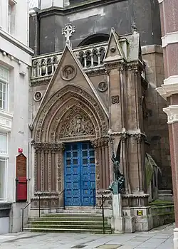 Scott demolished a house that had stood against the tower, replacing it with an elaborate porch, built in the "Franco-Italian Gothic" style (1858–1860), facing towards Cornhill.[3][15] It is decorated with carving by John Birnie Philip, including a high-relief tympanum sculpture depicting "St Michael disputing with Satan".[16] Scott inserted Gothic tracery into the circular clerestory windows, and into the plain round-headed windows on the south side of the church. New side windows were created in the chancel, and an elaborate stone reredos, incorporating the paintings of Moses and Aaron by Robert Streater[3] from its predecessor, was constructed in an Italian Gothic style. A contemporary account of the work explained that this was appropriate since "the classical feeling which pervades the Italian school of Gothic art enabled the architect to bring the classical features of the building into harmony with the Gothic treatment which our present sympathies demand".[14] The chancel walls were lined with panels of coloured marble, up to the level of the top of the reredos columns, and richly painted above this point.[14] It was said that Scott "proposes to brighten all the roof with colour... and he fuses the vaulting into something transitional between Pointed and Italian. And he inserts tracery in all the round-headed windows, and the great ugly stable-like circles of the clerestory become roses under his plastic hand."[3]