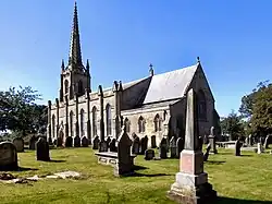 The church is built in sandstone ashlar with slate roofs. Its plan consists of a six-bay nave without aisles, a three-bay chancel with aisles which are now used as vestries. To the north and south gabled porches project slightly from the second bays from west. The other bays have lancet windows between gabled buttresses. The nave is in Early English style and the chancel is in Decorated style.[3] The steeple is in Perpendicular style.[12] It has angle buttresses and is in four stages. The parapet is embattled and pinnacles rise from the corners. The octagonal spire is recessed and rises to a height of 150 feet (46 m). It is crocketed, has three tiers of two-light lucarnes and is supported by four flying buttresses.[3] The authors of the Buildings of England series consider it to be "perhaps the finest work of Edmund Sharpe".[10]