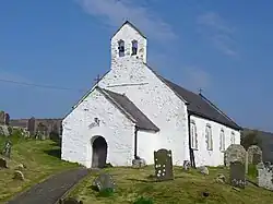 The Church of St Michael at present (October 2023) holds services every Sunday at 11.15am. It is a Grade I listed church in Penbryn, Ceredigion, Wales.[1] It is situated on a hillside on the western side of the Hoffnant Valley, approximately 0.5 kilometres (0.31 mi) inland from Penbryn beach. The precise date that the church was completed is unknown, but there is believed to have been an earlier church on the site during medieval times.[2] The Church in Wales states that it is of 12th-century origin, making it the oldest in the diocese of St Davids.[3] The roof is likely to be as old as the 15th century, though the porch is believed to have been added much later in the early 17th century. The windows were added in the early 19th century.[2]