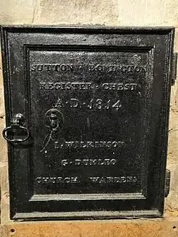 The tall church tower has a peal of six bells. Originally the peal consisted of just three bells, cast by Henry Oldfield's foundry in Nottingham, two of which remain; the oldest dates back to 1579 and is the second oldest bell in Nottinghamshire. Two more bells were added in 1849/50 and a sixth bell in 1977 purchased for the sum of £320 from St Andrew’s Church at Watton at Stone in Hertfordshire[3] to commemorate the Silver Jubilee of Elizabeth II. The weights of the bells range from 4cwts 86 lbs (treble) to 17cwts 97 lbs (tenor). The installation has recently been restored by John Taylor & Co, a large bell foundry in nearby Loughborough who cast a number of the bells.[4] The bells are rung for Sunday morning services and at fortnightly practice sessions.