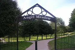 St Michael's Flags and Angel Meadow Park is a public park in Manchester, England, to the immediate northeast of the city centre, on a slope between the River Irk and Rochdale Road. It occupies an area of 7.4 acres (3 ha), and was once an affluent suburb, until the 19th-century Industrial Revolution altered the social standing of the area and introduced poverty and disease. Regeneration of the park in the 2000s has created a gateway into the Irk Valley.[1]