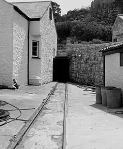 In 2018, the tramway was reported as being "still in regular use, perhaps not every day".[6] However, the National Trust, which acts as the island's custodian, is said to "prohibit visitors from seeing it", though it is mentioned in the Trust's publicity.[12] The only part readily accessible to the public is the disused last few feet, ending at the harbourside wall,[13] in which a pair of wooden buffer stops is embedded.[14]
