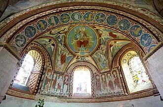 The vaulted apse is decorated with a variety of religious themed wall paintings depicting Christ in a mandala surrounded by angels and apostles.[4] The nave and chancel are extensively decorated with painted figures.[9] The apse arch displays the signs of the zodiac, and several other walls display complex decorations, inclduding flower and leaf patterns and scrollwork.[10]