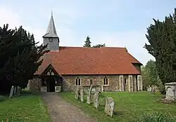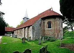 The original Norman church was built sometime after 1130 AD. It originally consisted of an early 12th-century semi-circular chancel and apse with a semi-dome stone vault and 3-bay vaulted nave.[1] In the late 13th or early 14th century, a South aisle was added. The south wall contains four arches: one late 12th-century, one late 13th-century, a possible 14th-century arch and a modern arch.[2] Later expansions include the South porch which was reconstructed in the 20th century and timber belfry with spire. The walls were originally built of coursed rubble with both Roman and medieval bricks and uncoursed rubble on the south side of the church.[3] Much of the original building survives today, especially in the apse with its original Norman vault. A remodelling of the church in the early 15th century replaced the original barrel vaulted nave with the current timber structure.[4][5]