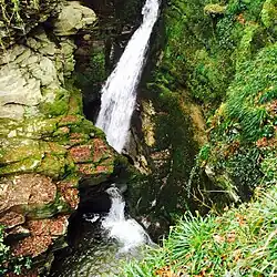 A building reputed to be the site of Saint Nectan's cell is situated at the top of the waterfall; the date of the building is uncertain. It is most probably an 18th-century summerhouse, and the legends are due to the imaginations of R. S. Hawker and William Goard, yeoman of Trethevy.[5] The current owners claim that the ruins of the chapel provide the lower part of the walls of a cottage erected in the 1860s, and extended around 1900. Tea gardens are open in the Hermitage grounds between April and October[6] and a new woodland walkway (opened March 2016) allows visitors to view the falls from above. These views were previously only available by climbing the rocks above the falls.