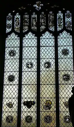 The 13th-century chancel has two rib vaulted bays, making it one of only six extant Early English vaulted chancels.[34] Its walls were raised in the 15th century by constructing a chamber above the vaulting using stone from the demolished 13th-century nave,[18] but, from the outside, this end of the church is still lower than the western section. Internally, the chancel vault is much lower than the adjacent nave because of the room above. It has three 15th-century Perpendicular windows down each side,[2] and is notable for the unusual east window with seven stepped lights, a feature found in only two other Early English churches,[35] Lincoln Cathedral and St Martins in Ockham.[16] The chancel contains three simple sedilia, or priest's seats, with trefoil arches and round columns. The sacristry behind the altar has a small lancet window,[2] and the chamber above the chancel, which is floored only by the curved upper surface of the vault below,[36] is lit by a single two-light window.[2]