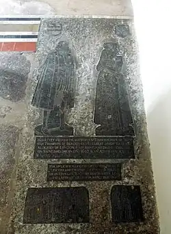 Monumental brasses combined as a one slab memorial next the altar at the north-east corner of the chancel is to An Thompson—the wife of Thomas Thompson—who died in childbirth, aged 31, on 25 July 1607, St James' Day. There are eight plates: one each of an image of a man and woman in Elizabethan dress; two with inscriptions; one depicting their nine sons; one their four daughters; and at the head one shield of arms each over Thomas and An.[21]