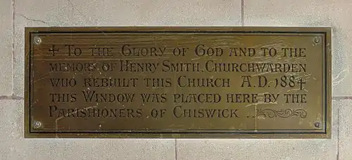 The current church dates from 1882 to 1884, when most of the building except the tower was demolished and rebuilt at the expense of the brewer Henry Smith of the nearby Fuller, Smith and Turner brewery. Several monuments survive, mainly in the tower. In the churchyard is a monument to the Italian poet and patriot Ugo Foscolo; his remains were returned to Italy, but the Italian government added an inscription to the monument. The painter William Hogarth's monument, near the church, has an epitaph by the actor David Garrick. In the burial ground is the grave of Frederick Hitch, a Victoria Cross recipient and veteran of the Battle of Rorke's Drift.