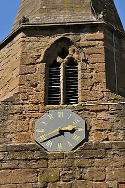 Simmons of Warwick made the present turret clock in the west tower in 1865. It is built to have three dials but only one, on the south side of the tower, was installed. However, in 1876 a dial was added on the ceiling of the ringing room. It has no hour hand, only a minute hand, and is for bell-ringers to time their ringing.[17]