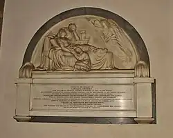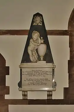 The most notable monuments in the church are wall-mounted Neoclassical marble reliefs. Joseph Nollekens (1737–1823) sculpted a putto leaning on a funerary urn to commemorate John Bird, who died in 1772. Richard Westmacott sculpted a relief of Caroline Gresley, who died in 1817. He shows her reclining on her deathbed, surrounded by her grieving family, as an angel hovers at the foot.[7]