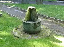 In the churchyard is a stone sundial of unusual design dating probably from the 18th century. It consists of a circular plinth on a circular stone step which carries a battered cruciform stem with an octagonal cap. The dial and gnomon are copper. It is listed Grade II.[ 8] At the churchyard gate is an 18th-century mounting block .[ 5] Also in the churchyard is the war grave of a First World War Canadian soldier .[ 9]