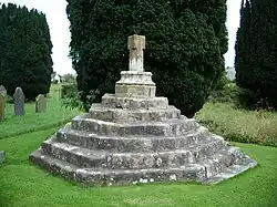 In the churchyard is a preaching cross. Its base originated as a calvary dating from the medieval era. The cross dates probably from the 17th century and it carries a sundial dated 1825.[5] It is constructed in calciferous sandstone and consists of seven octagonal steps on which is a cross base surmounted by the sundial, the brass plate of which is missing. It has been designated as a Grade II listed building.[6] The cross is traditionally linked with Calder Abbey. It is a scheduled ancient monument.[5][7]