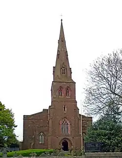 The steeple is built in red sandstone, and consists of a tower with a broach spire. It is in Decorated style and has fine carved detail.[3] The tower is in four stages, with diagonal buttresses and a pointed west entrance. Over the entrance is a three-light window, and in the third stage are lancet windows on three sides. The top stage contains two-light bell openings. On the spire are three tiers of lucarnes. To the south of the steeple is a canted stair turret with a stone hipped roof.[2] Other than the west front, the body of the church is in brick, with four-light Perpendicular windows along the sides of the aisles.[3]