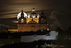 St. Paul's Cathedral is built in the Baroque style, with some influences from native Maltese architecture.[7] The main façade is in St. Paul's Square (Maltese: Pjazza San Pawl or Misraħ San Pawl), and it is set on a low parvis approached by three steps. The façade is cleanly divided into three bays by pilasters of Corinthian and Composite orders. The central bay is set forward, and it contains the main doorway, which is surmounted by the coats of arms of the city of Mdina, Grand Master Ramon Perellos y Roccaful and Bishop Davide Cocco Palmieri, all of which were sculpted by Giuseppe Darmanin. The coloured coat of arms of the incumbent archbishop (presently Charles Scicluna) is located just below the arms of Mdina. A round-headed window is set in the upper story above the doorway, and the façade is topped by a triangular pediment. Bell towers originally containing six bells are located at both corners of the façade.[11] It has an octagonal dome, with eight stone scrolls above a high drum leading up to a lantern.[10]