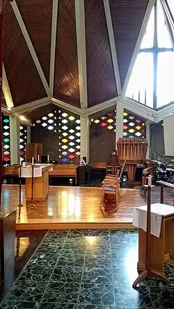 The building is a modernist, reinforced concrete buttressed form with a community centre on the ground floor and the church itself and church hall above. There is an organ loft at the west end and a small Lady Chapel behind the altar at the east.