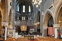 The altar apparently stands on the site of the Neptune fountain in the earlier Vauxhall Gardens. The alabaster reredos was designed by Pearson and made by Poole of Westminster; the mosaic is by Salviati of Venice. The frescos in the sanctuary are by Clayton and Bell, installed between 1866 and 1868. The scenes are: The Killing of Abel (1877), Melchisedech the High Priest (1877), The Last Supper, The Agony in the Garden, Christ Carrying the Cross, The Crucifixion, The Descent from the Cross, The Resurrection, Christ's appearance to the Apostles after the Resurrection. The stained glass in the upper lancets is by Lavers, Barraud and Westlake (1864-5).[2]
