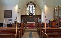 A medieval stone ambry is located west of the sedile which is located on the south wall of the chancel and formed from a relocated medieval trefoiled two-light window. The east end of the chancel is occupied with a five panel wooden reredos of circa 1736 featuring the Ten Commandments on the central panel with the Lord's Prayer and religious texts on the outer panels. The hexagonal wooded pulpit is 18th century and the stone font is octagonal.[1]
