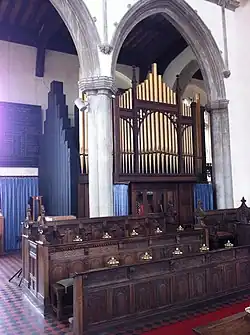 In the eighteenth century an organ stood at the west end of the church, but this was moved to the current position in 1864. A new organ was obtained in 1888, originally built in 1847 by Gray and Davison for St John the Evangelist's Church, Regent's Park, London.