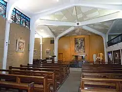 Inside the church is a continuous clerestory around the nave and transepts. The stained glass window scheme in the church was made by Gabriel Loire using the dalle de verre style in a complete figurative narrative design.[1] The Stations of the Cross that are oil paintings, the altarpiece, baptistry and the six angels in the Blessed Sacrament chapel were all designed by David O’Connell (1895–1976).[3]