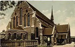 Construction work commenced in 1897 and the building was consecrated in June 1899. The Church was a brick building with stone dressings, and had a chancel, aisled nave and baptistery.[1] Internally, the church had many of the features associated with George Fellowes Prynne. This included red brick contrasting with white stonework, which was used to distinctive effect in the nave and at the chancel arch. A stone chancel wall divided the nave from the chancel, and there was an elaborate sanctuary and high altar. The altar front had painted panels believed to be the work of Edward Arthur Fellowes Prynne, the notable late Pre-Raphaelite artist, and the architect's brother, who also lived in Ealing.[3]