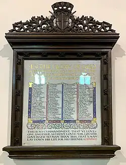 91 parishioners of St Stephen's were killed during World War I; their names are recorded in the war memorial inside the church, mounted on the wall of the North aisle. A number were decorated for courage; these included Charles Carey, MM, L. W. Moberley, MC, and Captain Charles George Douglas Napier, MC, DCM (1892 – 15 May 1918). Napier was a flying ace credited with nine aerial victories, flying the Bristol F.2 Fighter, before being himself killed in action.[7] When Napier was awarded his MC, it was noted in the London Gazette that he "displayed the greatest judgment, determination and daring".[8]