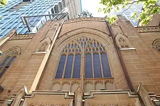 St Stephen's Church is designed in the Inter War Gothic style and occupies a prime location in Macquarie Street, opposite State Parliament. The masonry building includes a rectangular church and gallery, hall, offices and ancillary spaces. The main elevation is sandstone with carved tracery and leadlight windows and is symmetrical about the eastern window. Stairs located at the north and south sides of the entrance vestibule provide access to the gallery and Ferguson Hall below. The interiors feature extensive polished timber panelling and plaster ceilings that draw inspiration from traditional English Perpendicular Gothic.[2][1]