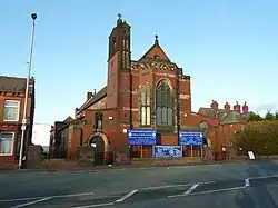 Constructed in glazed red brick, the church has sandstone dressings and slate roofs.[1] Its architectural style is Perpendicular with Arts and Crafts features. The authors of the Buildings of England series state that it is "typical of the later work of the [Austin and Paley] practice".[4] The church is orientated north–south, its plan consisting of a four-bay nave with clerestory, aisles that incorporate porches in their south ends, and a two-bay chancel. At the northeast corner of the nave is a bell tower, with its narrow side on the south. The lower part of the tower is in brick, and the top stage is stone, with blind tracery on the front and bell openings on the sides. At the centre of the south end of the nave is a tall canted bay containing transomed traceried windows. Above the bay is a chequered stone parapet.[1] Below the windows is a sill carved with a text.[4] The south end of the each aisle contains a doorway. Above the left doorway is a niche containing a statue, and over the right doorway is an oculus. Along the sides of the aisles are square-headed two-light windows, and in the clerestory are windows with pointed heads containing Perpendicular tracery. The north window has five lights.[1]