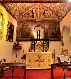 There were no significant alterations for several centuries after the tower was added, apart from a porch on the south side in the early 19th century, but like many ancient churches in the Brighton area St Wulfran's was subjected to a major restoration in the Victorian era. This took place from 1865 to 1867, and involved the rebuilding of the chancel arches to form one large central arch flanked by two smaller ones, replacement of all the pews, and new panelling and roof timbers in the chancel.[2][4] These were designed and painted by Charles Eamer Kempe, who had been born in the village and who later became a noted stained glass designer. Before his death in 1907, he provided seven windows for the church; he also designed a rood screen for the chancel, which was carved in the German village of Oberammergau.[4] (The village, famous for its woodcarving tradition, also supplied an intricately carved reredos to St Martin's Church in Brighton's Round Hill district.)[5] There are other painted and stencilled panels from the 19th century throughout the church, representing various Biblical scenes. The reredos was also designed in the late 19th century, and depicts various figures including St Richard of Chichester.[4][6] The painting over altar depicts St Wilfred and St Richard and was painted 1957-1963 by Maude Emily Bishop (1890-1975).