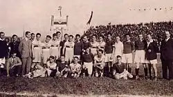 The stadium hosted Torino's home matches until 1962–63. It was the site of six of their seven Serie A titles (not counting the one revoked in 1927) and the stage they remained unbeaten for six years, 100 consecutive matches, from 17 January 1943 to the Superga air disaster, including the famous 10–0 victory over Alessandria (still a record in Serie A).[7] It was here that Oreste Bolmida performed (the trumpeter fan then made famous by the movie Ora e per sempre).[6] On 13 July 1943, in the middle of World War II, the Filadelfia was also bombed. Of the damaged parts were the field (used by the Allies to play baseball) and the stands near via Giordano Bruno. Despite the coverage the grandstand remained intact, although the metal beams were removed, probably to supply the arms industry, and replaced with wood.[5] The Filadelfia became unusable for a long time, and the 1943–44 season was played at the Stadio Motovelodromo Umberto I. Torino would later move to the Stadio Mussolini, the future Stadio Comunale.[7] After the war, renovations were carried out by the new club president Ferruccio Novo.[8]