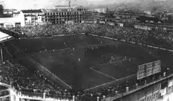 The facade was made of red brick, with columns and large windows with white frames. The various windows were connected by a gallery with iron railings. At the front was an old field that was used for training in the 1930s.[6] The main structure of the building was reinforced concrete, while the stands were composed of pillars supporting a network of longitudinal wooden trusses on which panels of asbestos were placed. The parterre was instead formed by masonry. The support of the flag which was located at the entrance was about 6 meters high; its base was covered with bas-reliefs depicting a Greco Deco style.[2] The field measured 110x70 meters and was covered with grass and had a drainage system. Under the stands was the caretaker's apartment, and fourteen rooms that were used by the players and the referee, the infirmary, club officials, and a hall for refreshments. Players could reach the field from the changing rooms through an underpass.[2] The stadium also underwent extension work. In 1928 a box office was added, and in 1932, the grandstand was expanded bringing the total capacity to 30,000 people.[2][4]